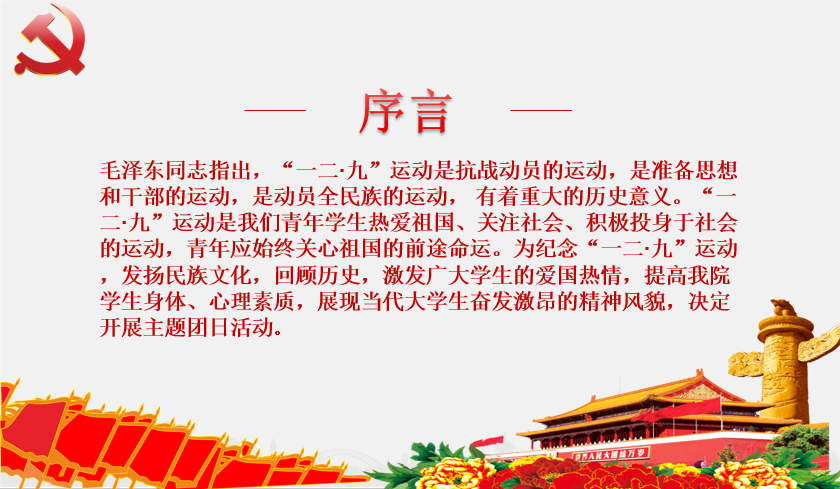 毛泽东同志曾指出,“一二·九”运动是抗战动员的运动,是准备思想和干部的运动,是动员全民族的运动,有着重大的历史意义。为纪念“一二·九”运动,发扬民族文化,回顾历史,激发广大学生的爱国热情,提高H视频