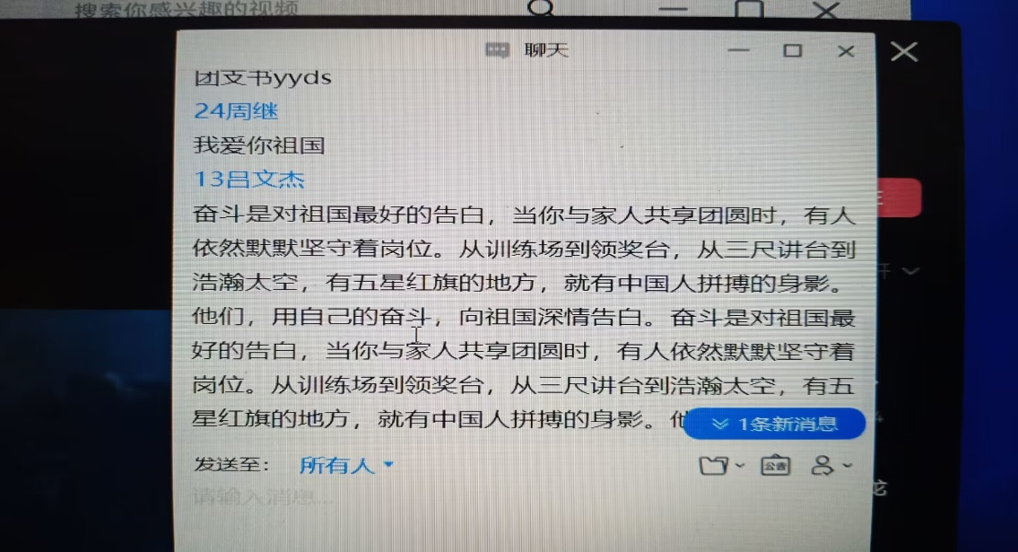青年人的告白往往最为真挚且动人,同学们在“向祖国告白”这一环节进行了热烈的讨论。起初大家还很拘谨,但在主持人抛砖引玉后,大家的热情被点燃,一条条令人感动的告白开始划过讨论区。吕文杰同学发布的“奋斗是对祖国最好的告白”, 彰显的正是青年人的爱国情怀和责任担当。讨论的结束也预示着此次活动的终结,但大家意犹未尽,结束后写下了自己的真情实感。