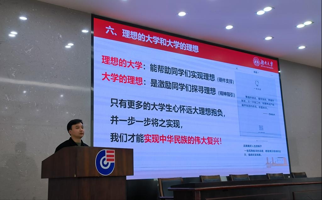院党委副书记潘刚峰为同学们做“读大学,我们到底读什么”专题讲座,从“成为更好的自己、建立良好的关系、学会理性做选择、学会处理负面情绪、追求高处的自由、理想的大学和大学的理想”六个版块,向同学们讲述如何度过一段充实又愉快的大学时光。在生活上,潘老师鼓励同学们积极健康,热情向上,以饱满的态度和昂扬的斗志迎接各种问题和挑战,拒绝摆烂和躺平的思想,充分展现大学生应有的青春活力。同时,潘老师也关心同学们的心理健康,为同学们提供了许多方法来缓解各种心理压力。最后,潘老师也对同学们提出了殷切的期望,希望同学们蓬勃发展、自由宽阔、成长成才。