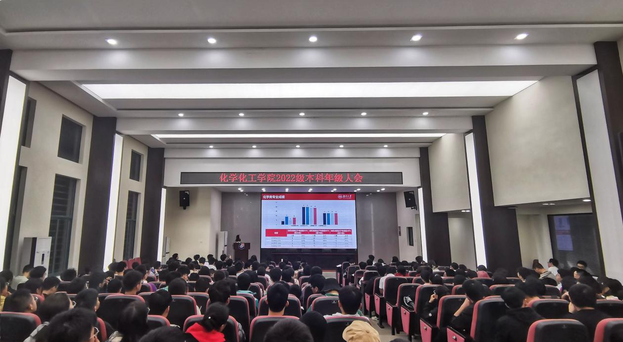 2022级本科生年级大会在新化工楼D区报告厅顺利召开。本次大会由张孙翔同学主持,学院党委副书记潘刚峰、本科2022级辅导员何妮翰和全体2022级本科生参与会议。