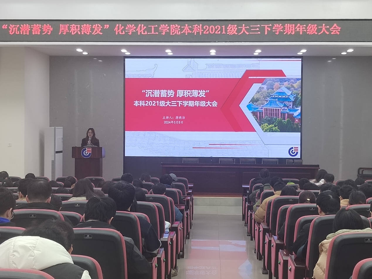 本科2021级全体学生在新化工楼D区报告厅召开年级大会。本次会议主题为“沉潜蓄势,厚积薄发”,由本科2021级辅导员兼分团委书记蒋晓洁老师主持。