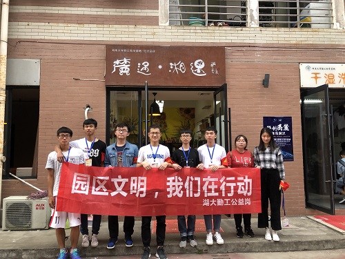 20日中午,参加此次值班的同学们十二点半前到达园区羽毛球场内的“麓遇湘遇”纪念品店集合签到。组长陈嵩同学分发臂章和工作牌后,依据组内人数和单车停放情况安排了各组同学负责的区域。