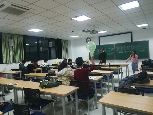 活动开始,高倩同学向大家介绍了第一轮的游戏规则。即全班同学分为四组,每一个小组成员都有一个气球,气球内部有一份关于生活中的化学小常识的题目。游戏开始时,其中两个小组成员之间分别展开争夺,率先踩爆对方气球,拿到题目,并回答出正确答案的小组得一分,累计得分最高的小组可以先行挑选礼物。最终,张琰峥同学所带领的小组率先夺魁。在这个环节中,大家懂得了更多的专业知识,也更好地提高了专业认知和学科自信,活动十分贴近“化学文化节”这个主题。