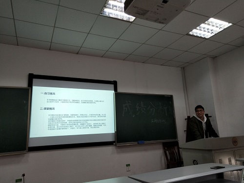 班会的第一项内容是成绩分析。在向同学们展示了全体同学的各门课程成绩后,应一学习委员陈侃对各门课程的成绩作出了评价与细致的分析。他先是表扬了班上各门成绩优异的同学,同时对那些在上学期中没有取得满意成绩的同学给予了鼓励。随后,陈侃同学将应一与应二的成绩进行了对比,给出了他自己的看法以及希望同学们学习成绩能够更优异的期待。