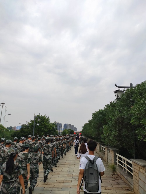 的新生们在哨声下迅速收拾着装紧急集合,并于天马二区篮球场集合整队,在新生班助理的带领下到达南校区体育场。在清点完人数并将伤病员带回后,化工院2019级辅导员夏忠诚老师、各排面教官以及27位新生班助理与新生们一起,踏上了十公里拉练征程。