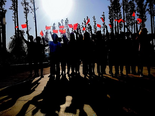 鲜红的旗帜在空中飘扬,同学们挥舞着手中的红旗在阳光下合影,本次团日活动到此圆满结束。