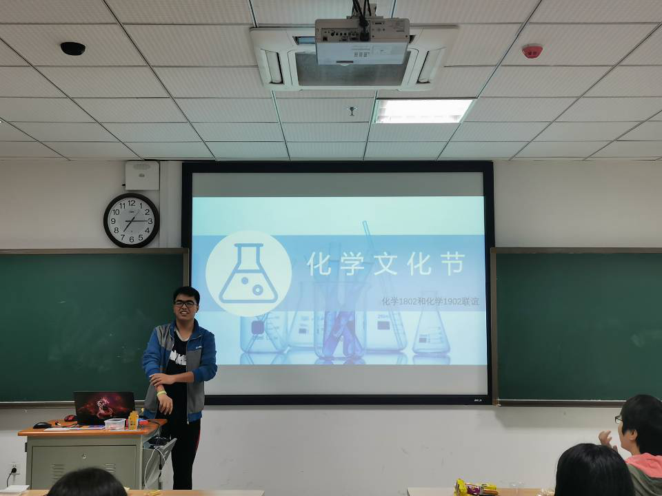 2019年11月23日晚上七点,由化学1802和化学1902共同主持的化学文化节联谊活动正式开始。化学1802班班导王兮老师、化学1902班班导唐丽娟老师和同学们愉快地度过了一个晚上,本次活动不仅使同学们深深感受到了化学的魅力,还加强了师生之间以及同学之间的感情。