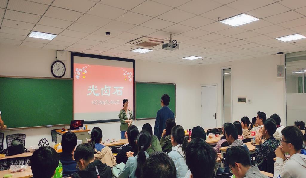 揭开化学雾蒙蒙的面纱后,想不想测测你和同学之间的默契度呢?那就让各种化学物质作为见证者吧。将游戏推入高潮的便是“心有灵犀”之化学版你比我猜,每组选两名同学上台参与,比划的同学依据某物质的化学性质,生动的动作演示来传达信息;而另一个同学则调动脑细胞,快速匹配信息,猜出所给物质。可能同学们觉得氢氧化钠这样的词语是小菜一碟,自然界中最硬的金刚石也不够打动心扉,便邀请到了化学1802班班导王兮老师和化学1902班班导唐丽娟老师来做难度系数五颗星的附加题,通过对像光卤石这些物质的猜测,两位班导向同学们展示了非凡的专业素养,活动再次被推向了高潮。