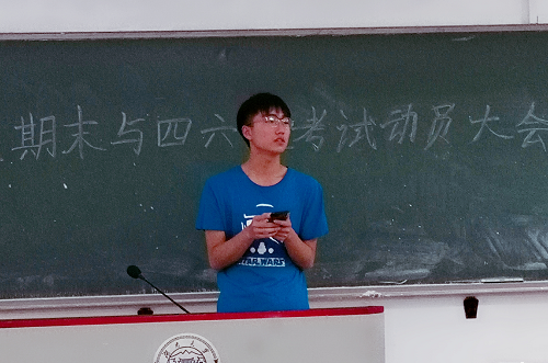 会上,班长进行主持,他先对大家做了考前提醒,指出在四六级考试中,同学们需要记得带好的必要东西,如准考证,身份证,2b涂卡铅笔与碳素墨水笔等。除此之外,他还提醒同学们要提前二十分钟入场,抓紧时间写完作文以便留出五到十分钟来查阅听力部分的题,做听力部分的题时,要边做边涂卡以免考完收卷时出现没时间涂卡的情况。提及期末考试的注意事项时,他着重强调了需要带黑笔和校园卡,并准时参加考试。同学们听讲十分专注,并且做了记录。然后委派班级里的几名同学下发了四六级准考证和四级成绩单。