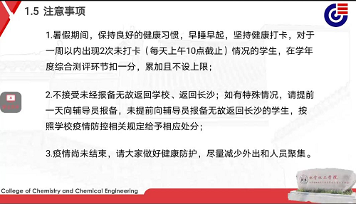 会议的第二项是辅导员南彬老师的讲话,南老师讲到了青年大学习的完成情况,希望下一学期完成率能够有所提高,还提到了暑假期间的疫情防控打开问题以及任何人不得提前返校,有情况需要报备等。南老师对上学期工作进行总结,也提出了这学期的要求。