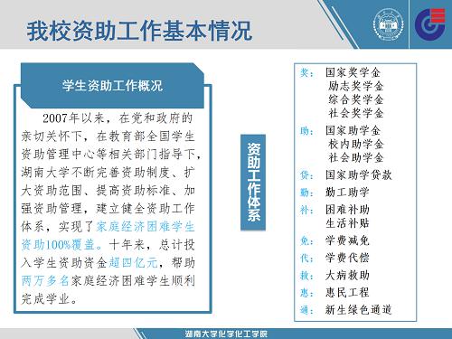 会议伊始,化工院资助助管王一鸣给“爱心使者”们介绍了党的十九大以来更健全的学生资助制度,其中包括资助投入大幅增加、资助政策体系在不断完善、资助管理政策在不断优化。而相应的政策实施在湖大学子身上就是“奖、助、贷、勤、补、免、代、救、惠、通”十余个方面。