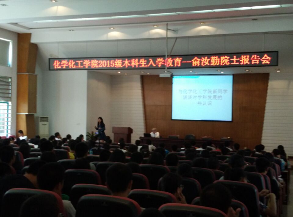 2015年9月29日,H视频 组织邀请俞汝勤院士为2015级新生开展入学教育讲座。陪同的有院党委副书记陈义红老师和15级新生辅导员刘卓老师。化工院学生早早来到报告厅占座,希望与院士更近一些,聆听院士的教诲。