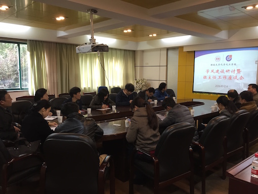 学风建设研讨会暨班主任工作座谈会在新化工楼D204召开,参会的领导老师有学院院长蒋健晖教授、学院党委书记王玉枝教授、党委副书记陈义红老师和各年级班导师及其辅导员。