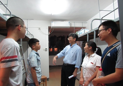 晚八点开始,老师们便一间一间寝室地去慰问新生们,亲切地询问新生们能否适应湖南的气候和饮食,对于宿舍是否满意等问题,并表示如果遇到任何困难都可以及时向班导师和班助们反映,他们会尽力解决新生们遇到的各种麻烦。新生们也都礼貌地向老师们打招呼,说出自己对湖大的初印象。新生们对于蒋建晖老师能准确说出他们每个人来自哪个地方感到十分惊奇,蒋建晖老师指着床架上贴着的写有新生名字的图纸解释道:“旁边的这个图案,就是你们家乡的一个著名风景点。”新生和家长们对学院在细节方面的认真和细心都备受感动。