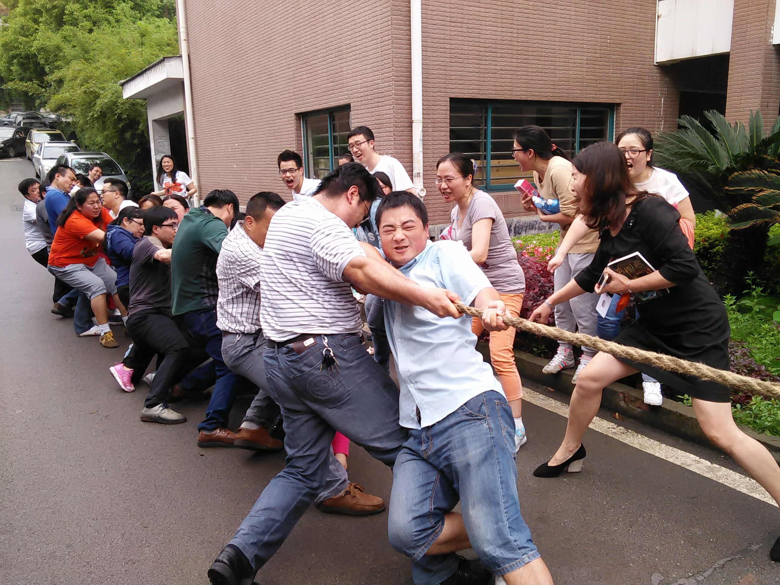 中午时分,在大赛开始之前,每支队伍都分别组织好了自己队的队员,大家都摩拳擦掌,准备着大干一场,为着荣誉和奖品而奋力一战。转眼到了比赛即将开始前的紧张时刻,排在前面顺序的队伍分别在两个场地排好了队形,大家捏住绳子,摒住呼吸等待裁判的哨声。在其中一个场地上,哨声还没吹响时,14级同学和应化化工教师队就蓄势待发,双方的队员之间互相暗暗鼓劲,紧张地等待着比赛的开始。“哔!”,清脆的哨音打破了赛场的安静,“加油!加油!”双方啦啦队的喊声响彻云霄,加油声此起彼伏,接连不断。两支队伍都个个憋足了气,脸涨得通红,拔河绳不停地来回移动着。经过了几番来回移动,14级最终惜败化工应化教师队伍,失去了晋级四强的机会。而这边的场地结束了第一轮比赛后,另一边的场地也结束了一轮比赛,紧接着两边又都开始了下一轮的比赛,又是一次惊心动魄的比赛,大家都奋力拼搏着,就这样,一轮又一轮比赛紧张地过去了,在比赛接近尾声时最终产生了进入四强的队伍,开始了对冠军的激烈角逐。四支队伍分别对抗,最终13级和机关教师队争夺冠亚军,两支队伍开始时一直僵持不下,然而都在拼命地往后躺想要将绳子拉到自己那一边,就这样僵持了一会儿,大家的脸涨的通红,绳子开始了向机关教师队的缓缓移动,伴随着助威声,老师们越拉越有劲,一鼓作气,最终将绳子拉到了自己的一边,赢得了最终的胜利。“我们胜利了”,老师们欢呼雀跃,笑声回荡在化工院周围。