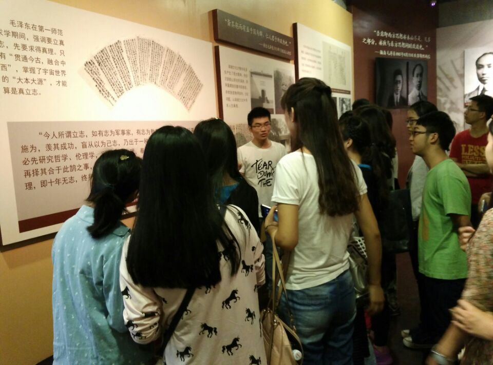 参观内容分为“走出乡关、求学师范”,“闹中求静、文明作风”,“游学之路、勇于实践”和“强健体魄”四个部分。分别由志愿解说的罗宇倩,刘新宇,余淑敏和赵磊负责为同学们解说。一张张饱含历史沧桑的照片,一件件深刻岁月痕迹的文物,一句句透着钦佩感慨的解说,向同学们讲述着毛泽东从小志存高远,求知若渴,从韶山冲里走出来,几经尝试,最终选择在师范学校学习的往事。余淑敏指点着湖南的地图说:“毛主席多次以游学的方式深入农村进行社会调查,借以了解社会学习书本上没有的东西。1917年他和同学历经千里行程,在长沙、宁乡、安化、益阳和沅江五县进行了调查。
