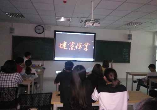 晚18:50,在团支书吴凡同学的组织下,全班同学准时到达了教室。首先进行了此次活动的第一项——观赏电影《建党伟业》。随着音响中带着年代感的声音响起,影片里每一帧画面在同学们眼前不停转换,故事拉开了帷幕。同学们逐渐陷入到这激情热血又充满历史感的剧情当中。