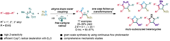 王兮教授和瞿双林教授团队,发展了炔烃、α-重氮硫鎓盐试剂、水的三组分偶联反应合成Z式1,4-二羰基烯烃。反应中水同时提供产物中的氧和氢,条件温和,底物普适,无论是对于一级、二级、还是三级烷基取代,甚至是超大位阻的金刚烷基取代的炔烃底物,都具有很好的兼容性和Z式选择性。使用连续流动相光反应装置可以将反应放大规模合成。使用廉价的重水作为氘源,反应具有很高的氘代率(D-inc. = 90~97%)。