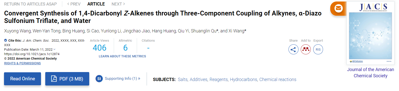 王兮教授和瞿双林教授合作,实现了卡拜自由基这类活泼有机中间体的可控的炔烃官能团化。以“Convergent Synthesis of 1,4-DicarbonylZ-Alkenes through Three-Component Coupling of Alkynes,α-Diazo Sulfonium Triflate, and Water”为题,在线发表在《Journal of the American Chemical Society》。