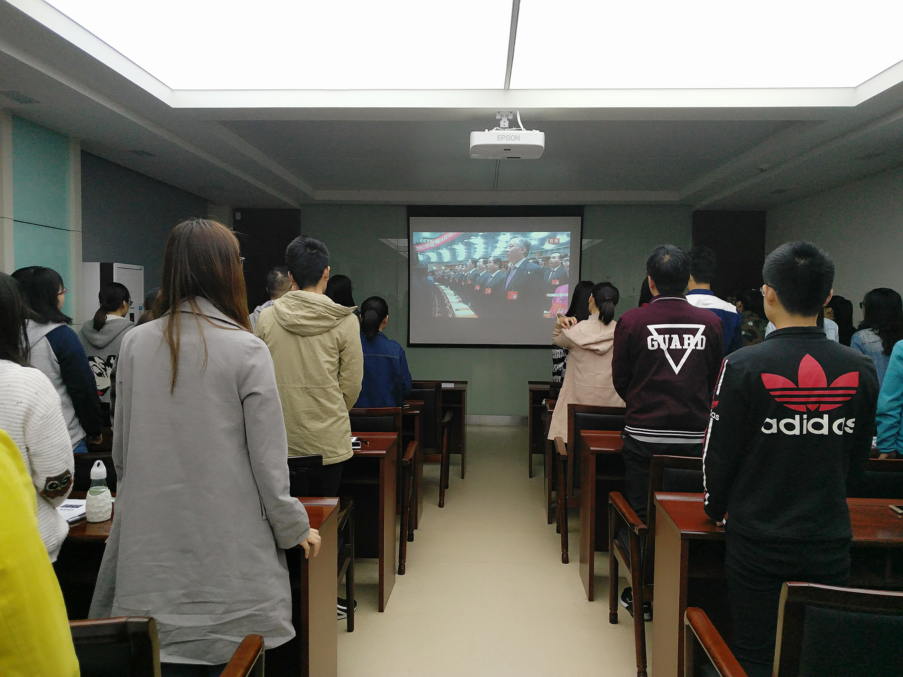 上午九时,十九大开幕式正式开始。隔着屏幕,十九大现场庄严盛大的场面已经使同学们的心情激动不已。开幕式由李克强总理致开幕词。开幕式伊始,国歌的前奏在会场响起,直直撞进同学们的心,会场全体领导以及屏幕外观看的所有同学都肃然起敬,齐唱国歌。满腔的爱国之情在心间涌动着。