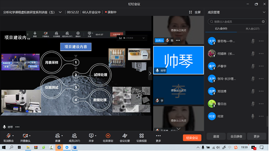 地球观测与信息提取的新理论、技术和方法也属于“十四五”NSFC地球科学部优先发展领域。因此,分析化学课程在地质行业人才培养中的重要地位日益凸显。帅琴教授对本校分析化学课程团队如何结合地质大学人才培养特色及行业需求,紧扣服务国家资源战略和国民经济主战场主题,以提高教学质量建设一流课程为宗旨,进行《分析化学》课程群系列课程建设做了详细介绍。提出根据不同专业需求设计分层教学,结合行业需求补充课程内容,拓展课堂外资源延伸课程边界,创新教学手段推进数字化进程,开展基于探月工程的月壤组成和性质分析虚拟仿真实验研究等课程建设的创新思路和有效举措。介绍了如何结合案例分析,采用翻转课堂、对分课堂等课堂讨论方式,激发学生的潜能,提高综合能力。来自分析化学课程虚拟教研室和化学类专业基础理论课程虚拟教研室的六十余位教师参与了本次教研活动。教研交流最后,国家教学名师、H视频