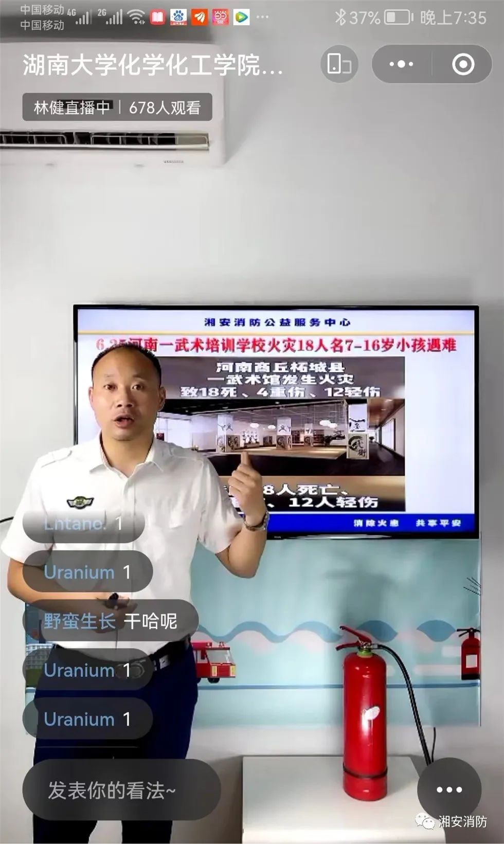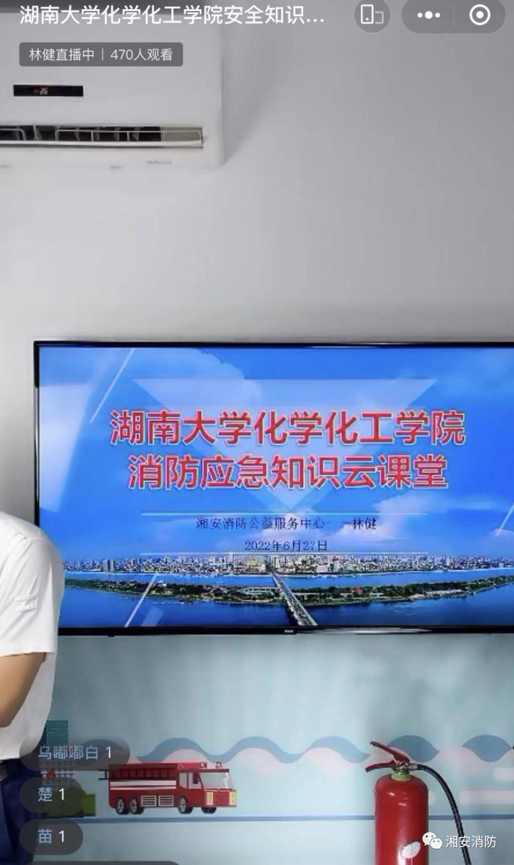 6月是第21个全国“安全生产月”,为切实加强学院安全工作,提高学院师生安全防范意识与自救能力,保障师生生命安全,6月27日晚,学院邀请湘安消防公益服务中心林健教官开展2022年“安全生产月”消防应急知识云课堂线上培训活动。全院近800名师生参与培训。