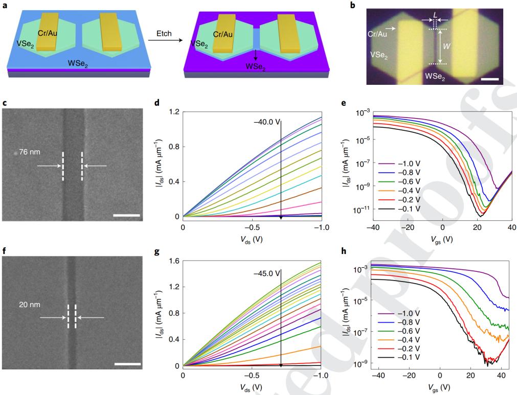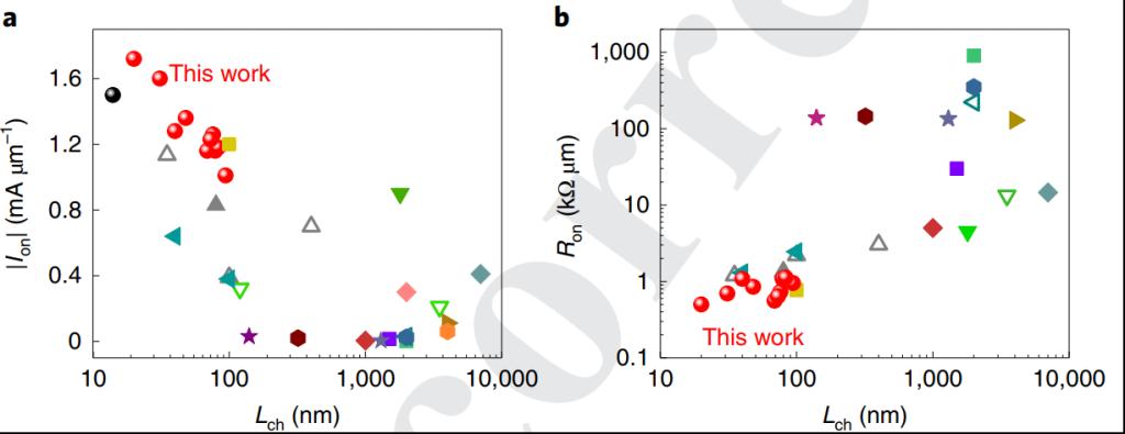 超短沟道双层WSe2晶体管的性能突破。