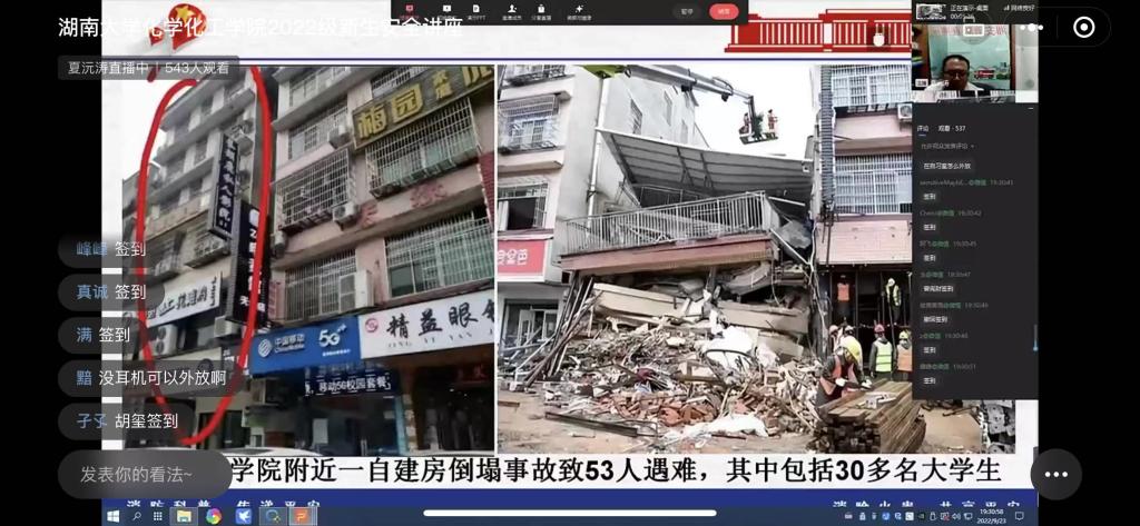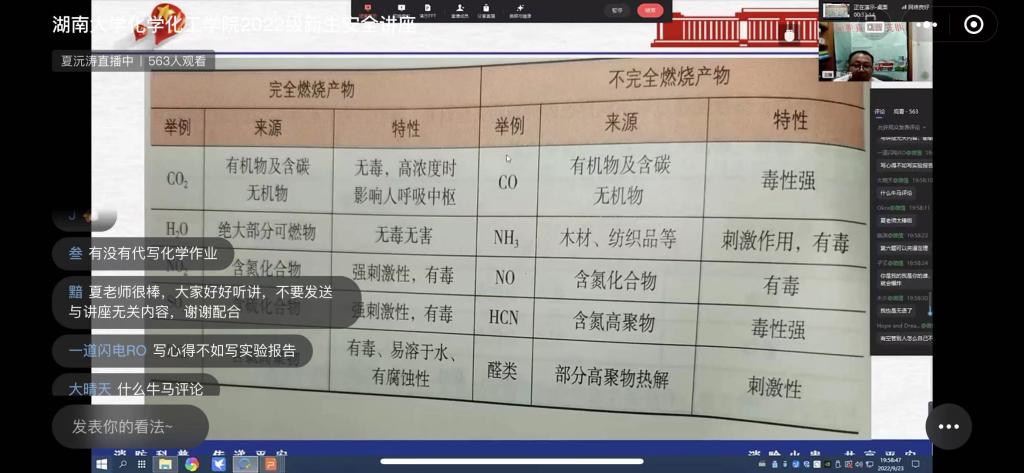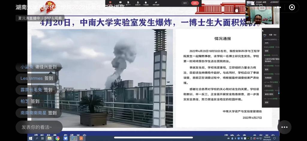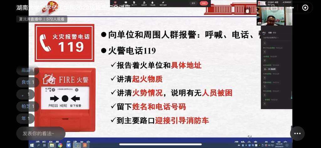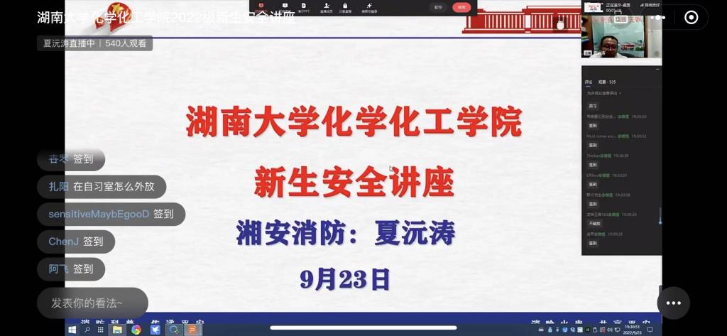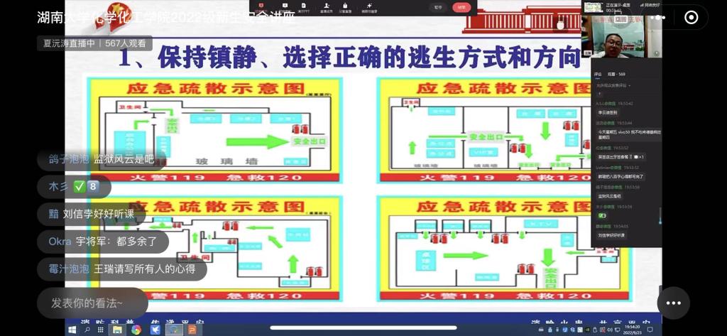 为进一步做好学院消防安全工作,帮助2022级新生树立消防安全防范意识,掌握消防安全知识,正确应对各类突发事故。9月23日,学院以线上直播的方式组织召开2022级新生应急安全讲座,全院研究生和本科生新生600余人参加。