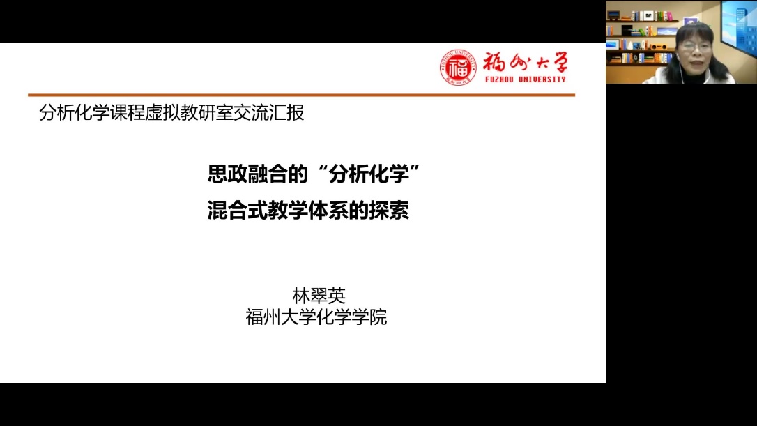 宦双燕教授主持,来自福州大学的林翠英老师为主讲嘉宾。林翠英老师是国家线上一流本科课程《分析化学》和福建省线上线下混合式一流课程《分析化学J》的课程负责人,她报告的题目是“思政融合的‘分析化学’混合式教学体系的探索”,参与本次虚拟教研室交流的有来自十余所高校的六十多位教师。林老师从福州大学化学学科人才培养、“分析化学”课程建设目标、混合式教学设计及实施、混合式教学成果四个方面做了详细报告。对“C3H3嘉锡教育理念”,即清醒的头脑(Clear Head),灵巧的双手(Clever Hands),整洁的习惯(Clean Habit)做了深入阐述,介绍了如何面向“C3H3”化学创新人才培养进行课程体系的建设,从基础知识、深度知识和广度知识三方面构建模块化知识体系,将线上教学资源融入线下教学过程管理中,将思政元素融入到教学内容中。教学中引入公共安全事件案例,培养学生的学科和专业使命感,同时让学生了解学院的科研创新成果为国家和社会做出的贡献,提升学生的自豪感。随后,林老师和与会教师做了教学经验的互动讨论,思政融合的“分析化学”混合式教学体系探索为化学学科创新人才培养提供了好的建设思路和借鉴经验。