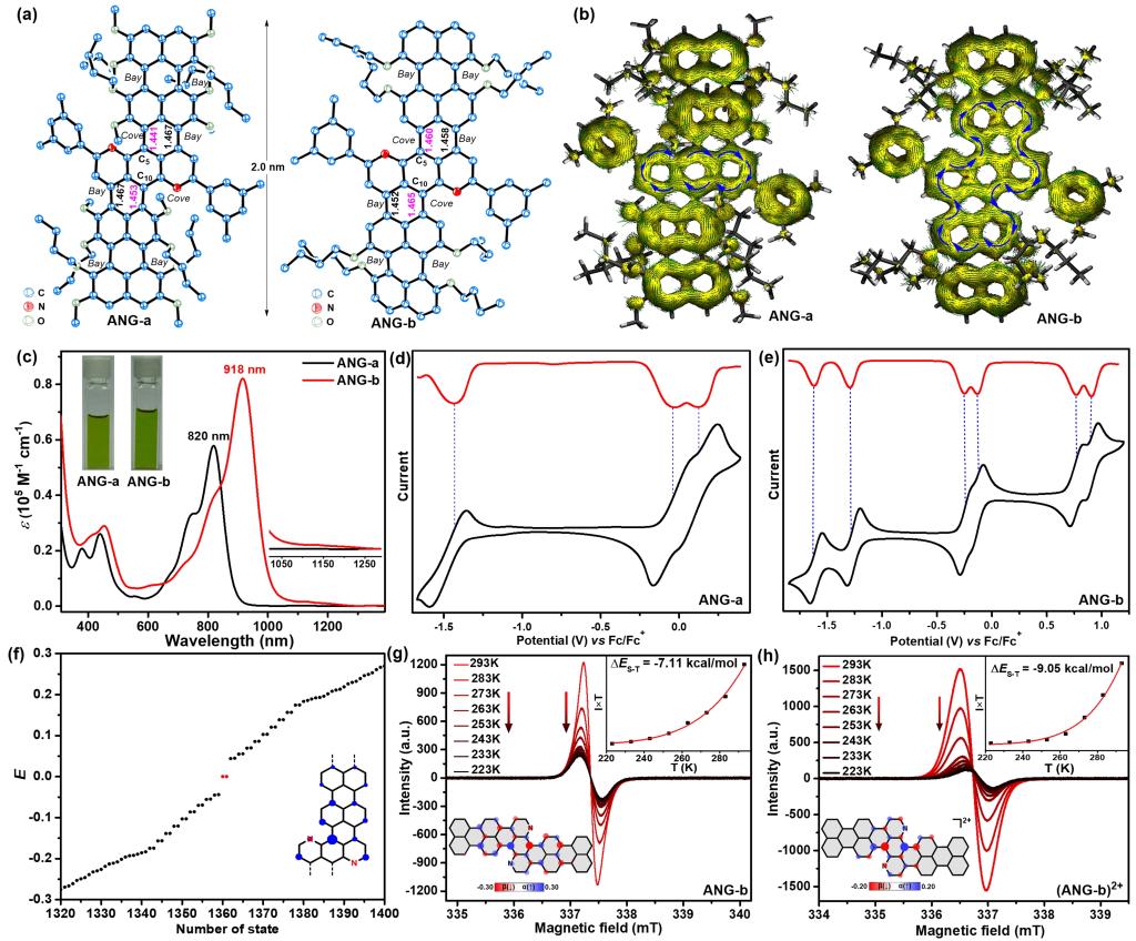 ANG-a~b的单晶结构(a)、ACID图谱(b)、吸收光谱(c)和电化学性质(d~e)及其ANGs能级示意图和超晶格的界面态电荷密度(f);ANG-b和(ANG-b)2+的变温ESR谱图和自旋密度分布(g~h)。