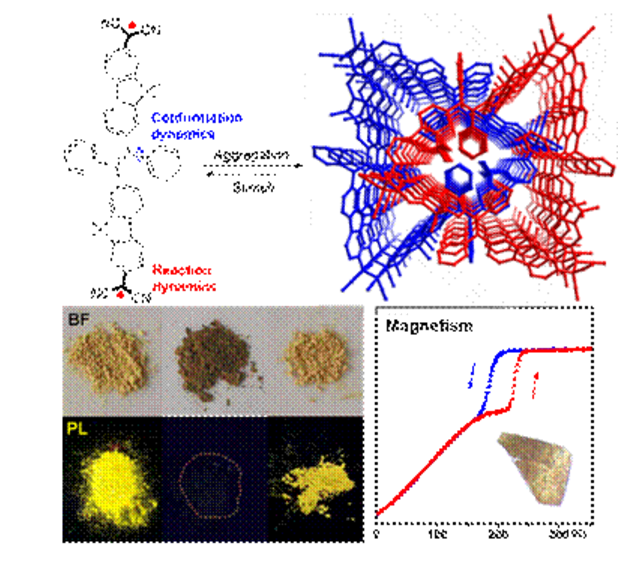 二氰芳甲基类自由基因自由基聚合-解离平衡的动态共价化学行为,在分子聚集体中具有高动态活性,极少发生副反应,同时在断键解离产生自由基功能基团,获得可激活、可程序性设计的光电磁性能转换。而四芳基乙烯的螺旋桨砌块,则有助于聚集体带来可调控的孔道结构,为分子有效运动和功能转化提供空间保障。作者发现原位产生的双自由基分子(如图所示)在浓缩聚集过程中,以分子间的自由基动态偶联方式形成唯一的环状三聚体,并有序组装成复杂的有机多孔框架。所构建的多孔框架受外界环境的影响,比如甲苯和二氯甲烷中生长的晶体材料,呈现出差异化的孔隙、偶联键长、扭曲夹角等结构参数,表明其框架结构具备较好的结构可调性和适应性。这类三聚体环状的框架材料拥有多层次的三维多孔贯穿通道,其内在结构和自适应行为具有以下特性:1)双自由基-三聚体的动态平衡中,自适应的碗状双自由基单体快速形成潜手性的三角形,展示出凸凹面堆叠的鱼磷状堆积模式,由此产生有意义的三维网络通道;2)因分子砌块集自由基动态平衡和四芳基乙烯的灵活柔性于一体,多孔框架材料对外界机械力、热刺激均表现出较好的自适应性,且伴随着光学吸收演变、开/关的辐射荧光和磁双稳态等信息输出。