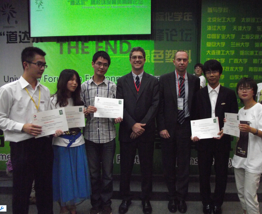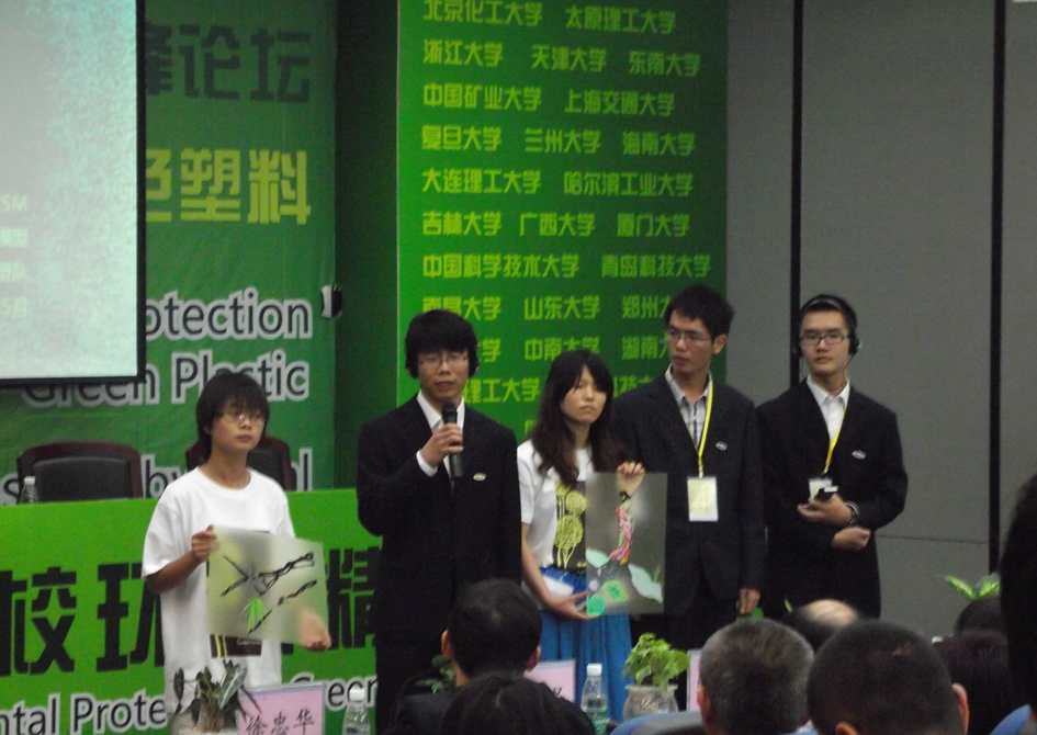 土木工程学院2008级佘羽8名本科生组成,他们设计的作品“集成绿色环保经济节能大规模回收再利用废弃塑料处理系统社会模型”在论坛中得到了评委和嘉宾们的好评,尤其是独特的“绿点”创意吸引了法国评委们的关注。他们以废旧塑料为材料制作的工艺品《仕女图》、《争春》两幅版画得到了现场观众们的赞许,他们的优异表现给现场的评委嘉宾和各高校的参赛选手们留下了深刻的印象。最终“湘塑”代表队凭借着优异的综合表现在全国16所高校的19支代表队中脱颖而出,以第三名的成绩成为获得金奖的八支队伍之一,为H视频