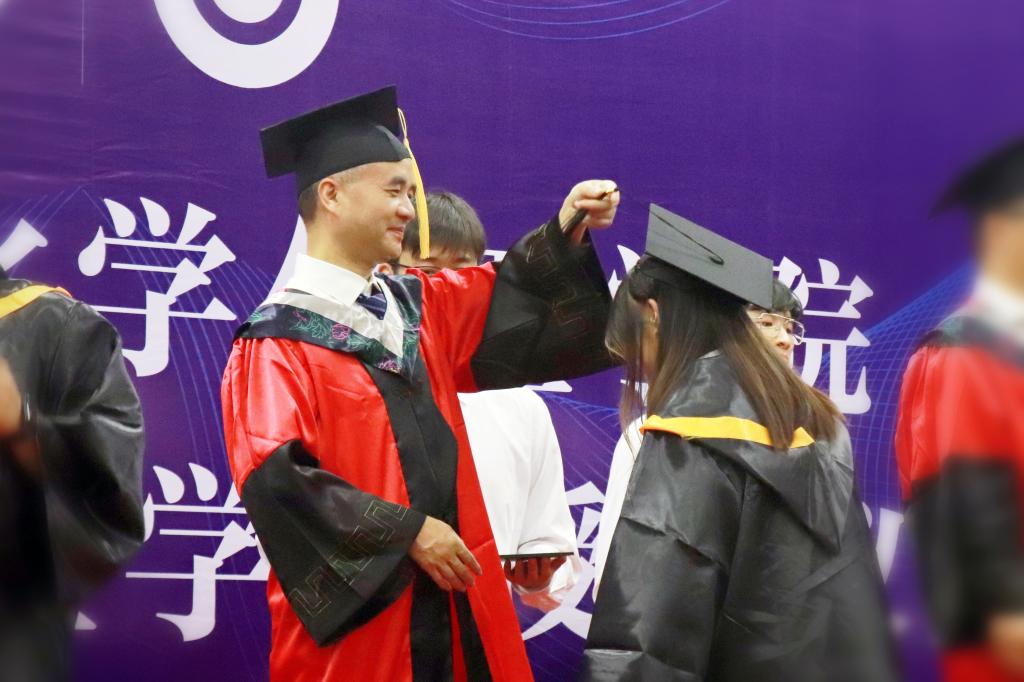 随后,副院长李永军教授宣读《关于2023届本科毕业生学士学位授予的决定》;副院长赵万祥教授宣读《关于2022-2023学年度博士、硕士学位授予的决定》。学位授予环节,毕业生们依次走上主席台,双手接过学位证书,主礼教授们为毕业生们拨转流苏、授予学位,为同学们在H视频