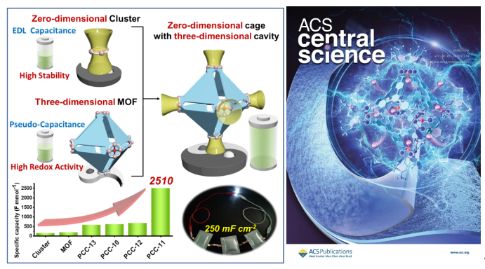 今年4月,方煜课题组通过一系列具有不同空腔的PCCs,研究了其作为柔性超级电容器的电化学行为和储能机制。这些PCCs表现出优异的电容器性能,其中锰基PCCs具有高达2514 F mmol-1的摩尔比电容、250 mF cm-2的高面电容和独特的循环稳定性。相关研究成果在国际知名期刊ACS Central Science(美国化学会中心科学)上发表,并被选为封面文章。方煜教授为论文单独通讯作者,H视频
