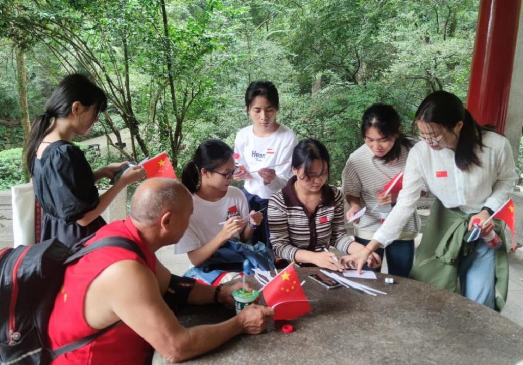下午3时,同学们在签到,领取党旗、国旗,集体合影后从岳麓山南大门出发,一路途径爱晚亭、蒋翊武墓、肖劲光铜像纪念园、长沙会战碑及蔡锷墓等打卡点,在各个打卡点进行党史答题,细致了解每一处打卡地的特殊意义,并获得“通过”章,最终兑换为奖品。