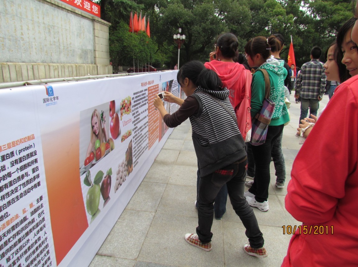 10月15日,2011年国际化学年湖南省化学开放日图片展在长沙东方红广场举行。几十米长的展示牌上,图文并茂,生动形象地向公众介绍了化学的历史、化学与生活、化学与未来等相关科普知识。在图片展现场,众多市民伫立而观。