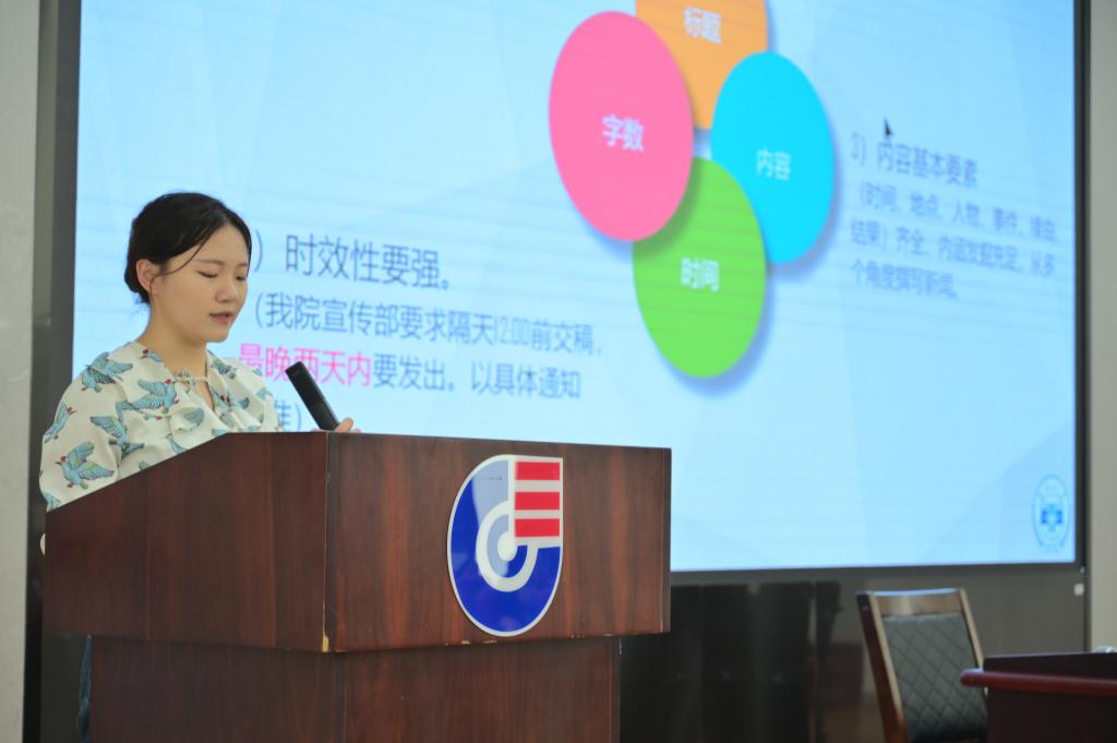 随后,梦想起航-精英训练营第一期培训由新闻与传播学院学生会宣传部部长施瑾同学作分享。施同学以“新闻宣传与文字综合能力提升”为主题,从新闻稿撰写、拍摄规范、推文制作、公众号运营、宣传工作规范与创新等方面进行了详细的讲述,为同学们接下来开展学生工作提供丰富的实操经验。
