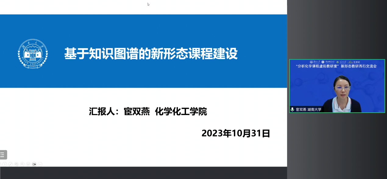 宦双燕教授以“基于知识图谱的‘分析化学’新形态课程建设”为题,向各参会成员进行了报告。宦教授分享了教育数字化转型背景下新形态课程建设的理念和实践,介绍了如何依托虚拟教研室平台开展新形态教研与知识图谱建设,并以H视频