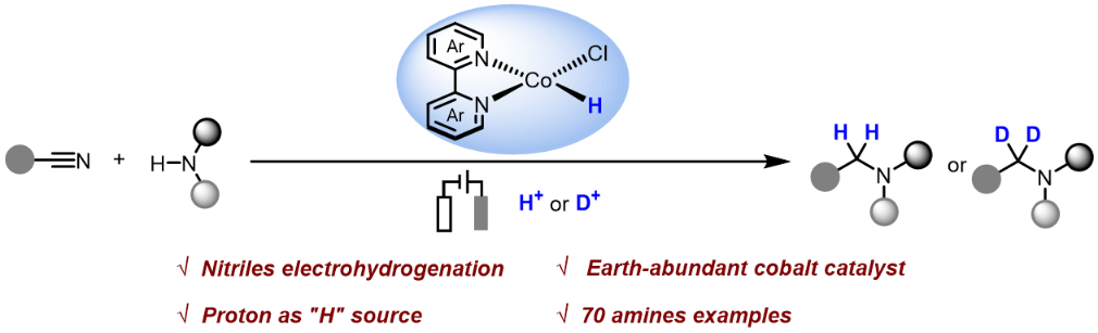 刘劼课题组报道了以质子作为氢源,通过电化学方式形成Co-H物种,使用广泛易得的腈类和胺类化合物为底物,实现了电化学腈类化合物还原胺化反应,合成了70个结构多样的仲胺和叔胺类化合物。通过化学反应动力学、同位素效应实验、电化学循环伏安以及恒电位电解等机理研究实验提出,阴极还原形成的钴氢物种向腈的氢转移步骤为决速步。此外,这种方法还可实现药物分子如氨氯地平的后期官能团化以及在胺上N原子的α位引入氘,为发展电化学高效、高选择性氘代同位素标记提供可行方案。