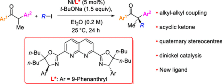 陶忠林课题组以双镍配合物作为催化剂首次实现了非环状酮类化合物与非活泼烷基碘代物的不对称偶联反应,以较高收率和对映选择性得到a位含季碳手性中心的酮类化合物。反应具有较好的底物适用范围和官能团兼容性,反应的产物经过简单步骤就可以转化为含季碳手性中心的化合物。该类新型的双金属催化体系有望为羰基α位的直接不对称官能化反应提供有效工具。