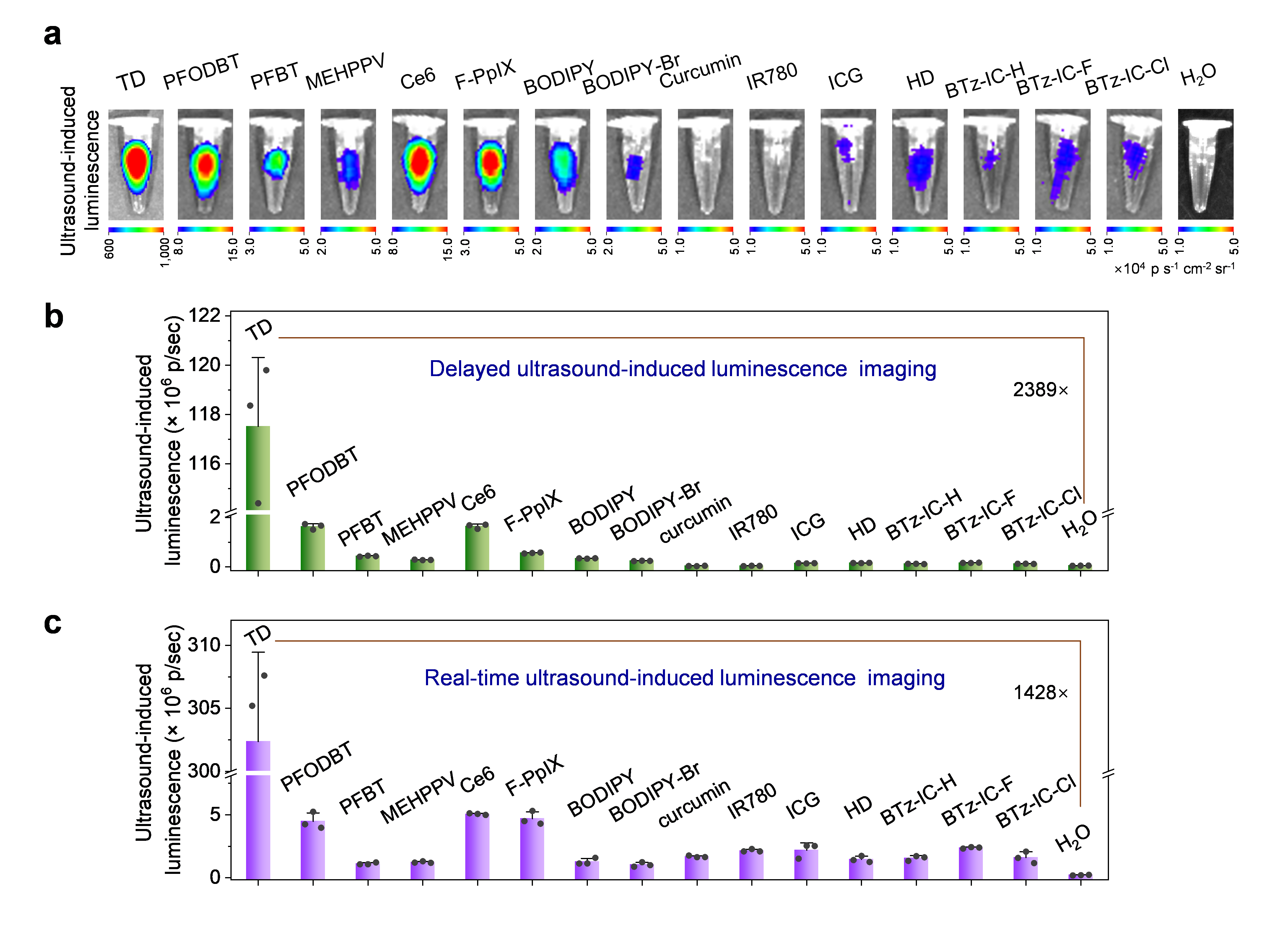 图2、(a)延迟超声激发分子发光成像模式下各个纳米粒子的发光图。(b)延迟超声激发分子发光成像模式和(c)实时超声激发分子发光成像模式下的纳米粒子发光强度定量图。