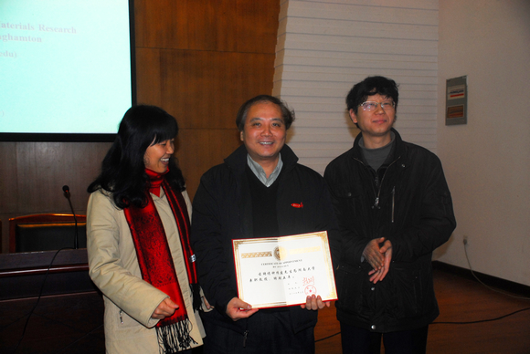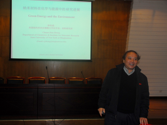 蒋健晖院长和王玉枝书记颁发聘书。之后,钟教授作了题为“纳米材料化学和能源中的研究进展”的学术报告,钟教授就合金纳米粒子的制备和应用,纳米结构的表征,及相关理论的研究进展作了较为详细的介绍,与会人员听完报告后给予了很高的评价,他的学术报告对与H视频