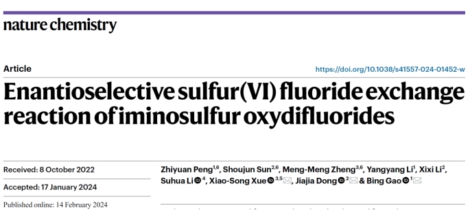 相关工作以“Enantioselective sulfur(VI) fluoride exchange reaction of iminosulfur oxydifluorides”为题发表在国际化学顶级期刊Nature Chemistry。该研究工作得到上海交通大学董佳家课题组的支持和帮助,为课题提供关键原料和技术支撑;中科院上海有机化学研究所、杭州高等研究院薛小松课题组在机理研究和理论计算方面做出了重要贡献。两位教授和所在单位均为共同通讯;H视频