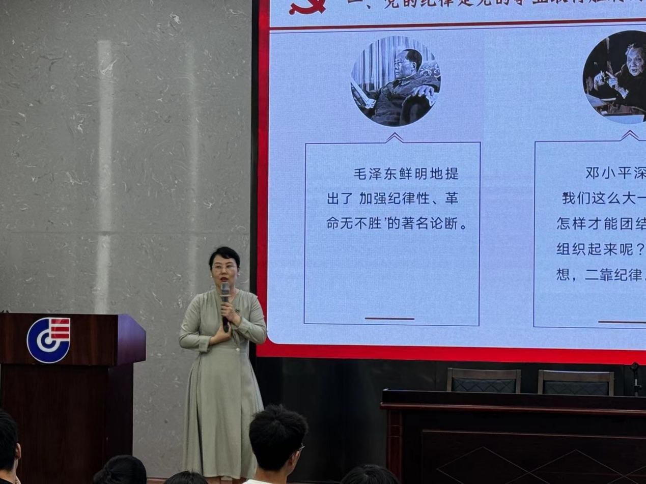 李洪玉老师详细解释了党的纪律的重要性及如何在日常生活中维护党的形象和纪律,弘扬党的优良作风,成为遵规守纪的模范。