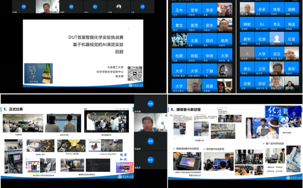 张永策老师对DUT首届智能化学实验挑战赛:基于机器视觉的AI滴定实验从最初的构思探索,到申办比赛、报名培训、备赛、正式比赛的历程做了详细介绍。为了筹备这次比赛,团队经过多方调研,制定方案,确定选题,动员了21组参赛队伍60人参加比赛。正式比赛时,现场采用实时记分牌,腾讯直播巡考。选手的比赛分五轮进行,每轮15分钟,包括酸碱准备、自动滴定、数据统计、程序调试等,最终用腾讯文档确认提交三组数据。张老师总结了比赛过程中的经验和不足,还介绍了学生在比赛中跨专业合作提出的一些创新想法。报告后老师们就基于人工智能的创新实验进行了深入交流。最后国家教学名师王玉枝教授进行了总结发言,赞扬了张永策老师敢闯敢干、勇于创新的精神,号召虚拟教研室成员关注实验教学,让创新理念做法在虚拟教研室内遍地开花。