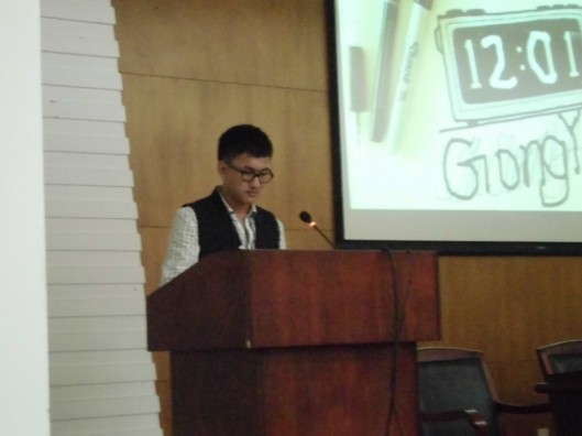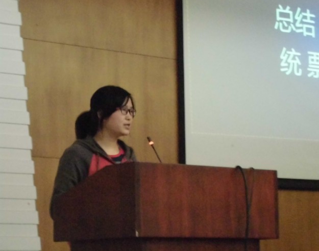 晚上七点整,在12级团总支陈灿讲解了活动流程之后,各班班长按照预先抽签的顺序依次上台演讲申请五四红旗团支部。各班都展现出了半年以来在学习工作、班级团结等各方面取得的重大成就,大家答辩形式丰富多彩,包括图片视频在内的多重方式展现了新一届化工学子多才多艺、积极向上的一面。特别是化学基地班,虽然没有一起的军训作为班级的感情基础,但是在班长负责扎实的领导下,班级的凝聚力一步步得到提升,最终在这次评选中获得大家的一致认可,在参选的八个班级里脱颖而出,和化学一班、应用化学一班同时进入复选阶段。