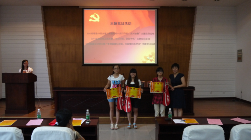 2012-2013年度“七·一”表彰的决定》,并向受到表彰的先进集体和个人表示衷心的祝贺,荣获“先进党支部”、“最佳主题党日活动”、“优秀共产党员”、“优秀党支部书记”、“党员示范寝室”等奖项的代表一一上台领奖,将会议推上了高潮。