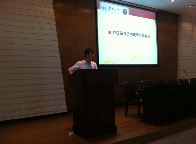党委副书记陈义红老师发表讲话。陈书记为大家大致介绍了迎新工作流程和迎新注意事项。陈书记指出,作为化工院的一员,作为学长学姐,志愿者们要注意自己的言行举止,时时刻刻为新生树立榜样,展示化工学子的青春风采。接着,12级辅导员陈晓晖老师更为详细地讲解了迎新流程,再次强调了迎新注意事项,以便让志愿者们在未来3天中将工作有条不紊地顺利进行。