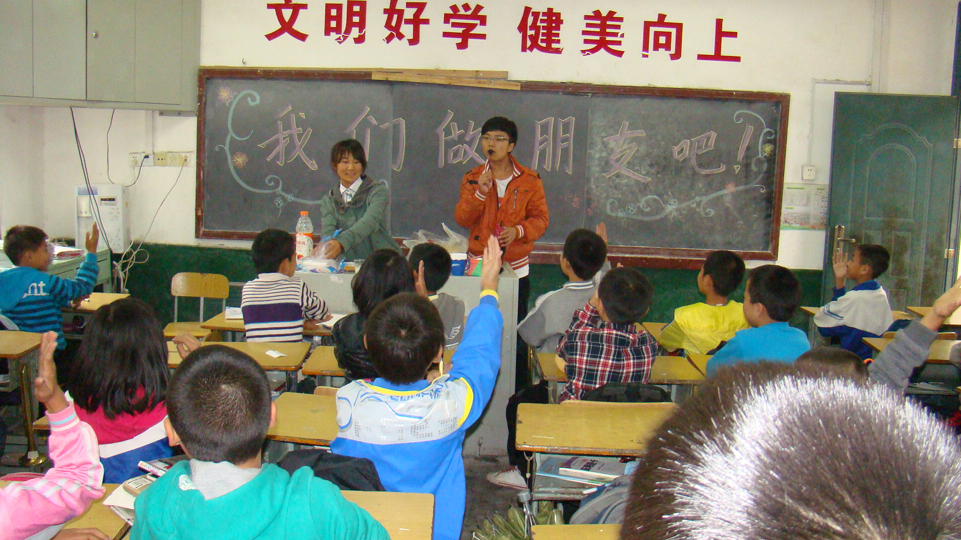 在青年志愿者协会部长陈名强的带领下,资料整理员孟阳,三位副部长丛珊珊、石倩、叶珮等一同来到樟树门小学,组织四、五、六年级召开了以“我和你做朋友”为主题的主题班会。