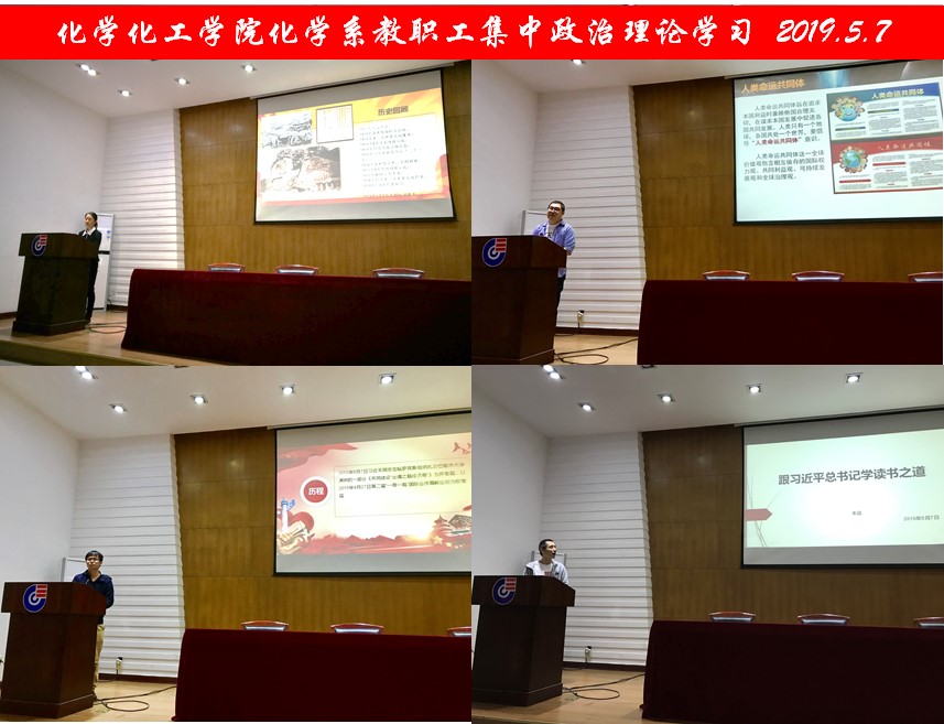 化学系党支部一直认真贯彻落实教职工集中政治学习制度,在化学系教职工中加强意识形态领域的宣传教育,让广大青年教师积极参与到政治理论学习和宣讲中,在思想上政治上行动上同党中央保持高度一致。